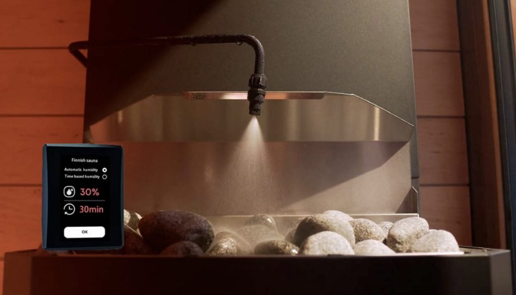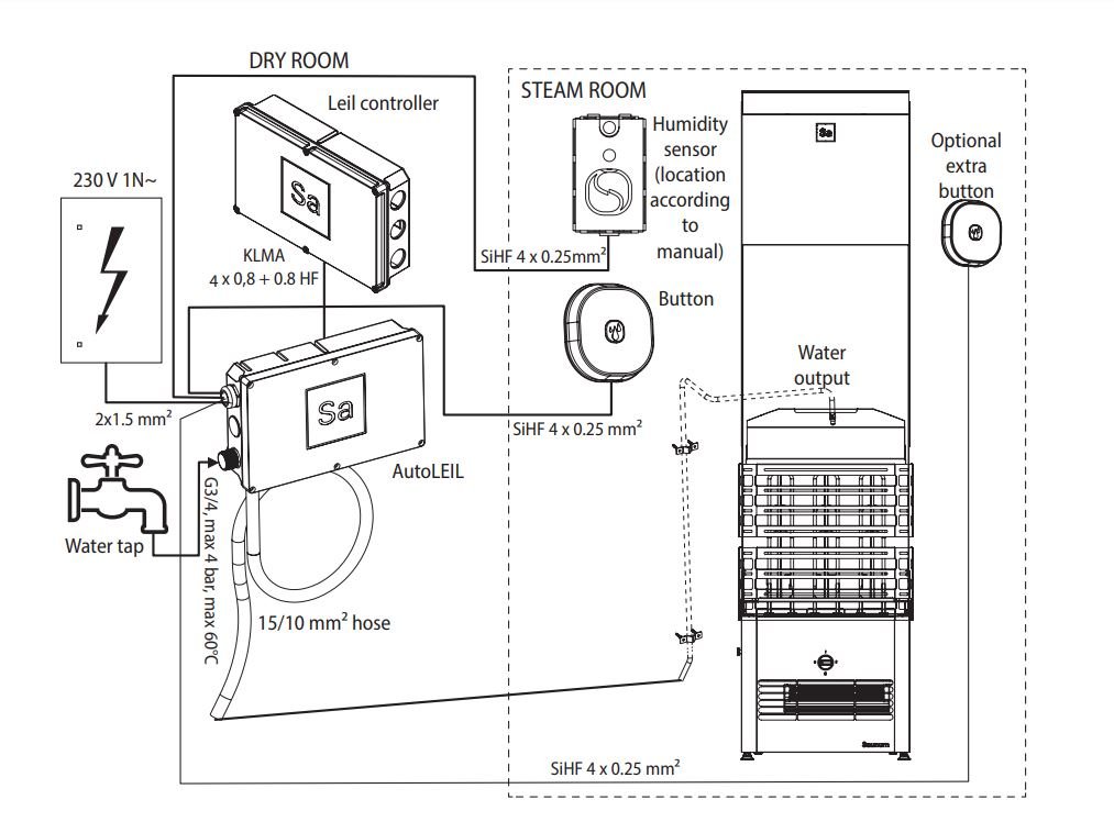 - Automatické dávkování vody pro udržení požadované úrovně vlhkosti (ovládáno panelem Saunum Leil)