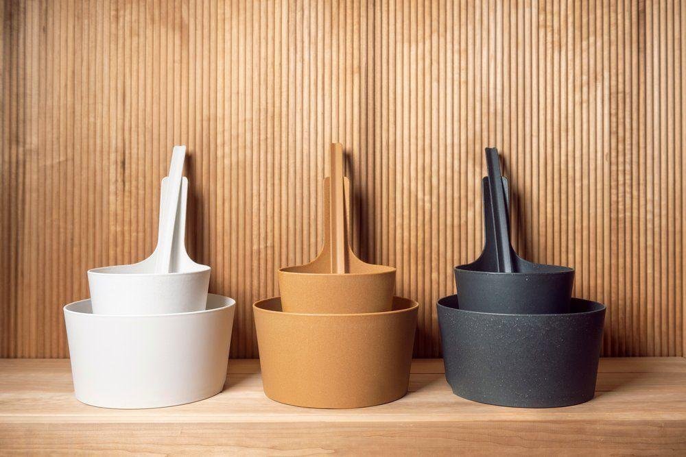 K dispozici jsou ve třech harmonických barevných variantách, kolekce Rento Pisara zahrnuje kbelíky, naběračky a umývadla, které se navzájem dokonale doplňují. Využívajíc ekologického biokompozitu DuraSense™ od Stora Enso s obsahem dřevěných vláken 40 %, tyto produkty obsahují granule složené z polymerů a dřeva s certifikací FSC® z norských lesů spravovaných zodpovědně. Materiál lze znovu použít až sedmkrát a lze ho recyklovat nebo spálit pro energii, což dále podporuje udržitelnost.