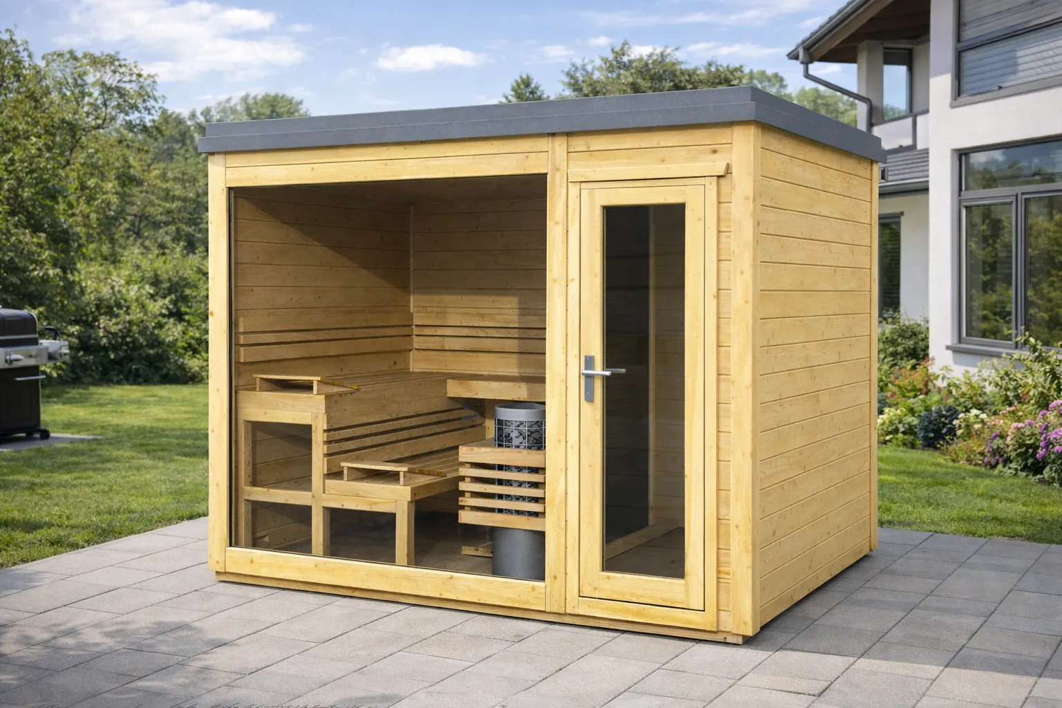 Domek je vybaven izolovanou střešní konstrukcí (14 cm minerální vaty) s designovou plechovou atikou v barvě antracit. Tepelný komfort doplňuje izolovaná podlaha (5 cm polystyren) a okna i dveře s izolačním dvojsklem, které minimalizují úniky tepla. Interiér je vyroben ze severské osiky nebo výběrové lípy – materiálů, které jsou díky nízké tepelné vodivosti ideální pro pohodlné saunování.