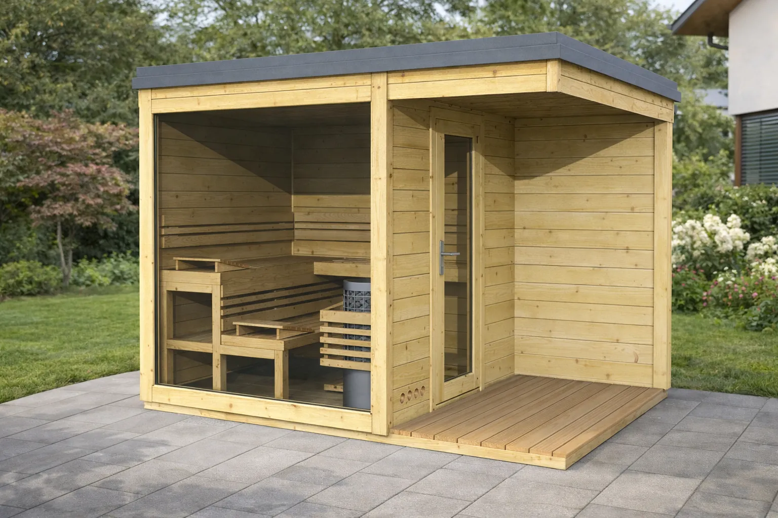 Domek je vybaven izolovanou střešní konstrukcí (14 cm minerální vaty) s designovou plechovou atikou v barvě antracit. Tepelný komfort doplňuje izolovaná podlaha (5 cm polystyren) a okna i dveře s izolačním dvojsklem, které minimalizují úniky tepla. Interiér je vyroben ze severské osiky nebo výběrové lípy – materiálů, které jsou díky nízké tepelné vodivosti ideální pro pohodlné saunování.