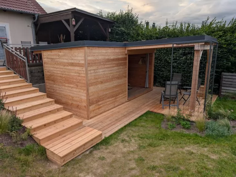 - Střecha sauny je z důvodu nové pultové střechy nad stodolou pobitá smrkovými prkny bez hydroizolační krytiny