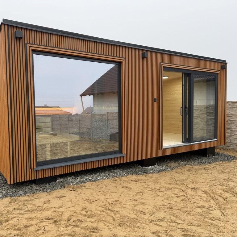 - Exteriér je obložen dřevoplastovým obkladem ve stylu provětrávané fasády.