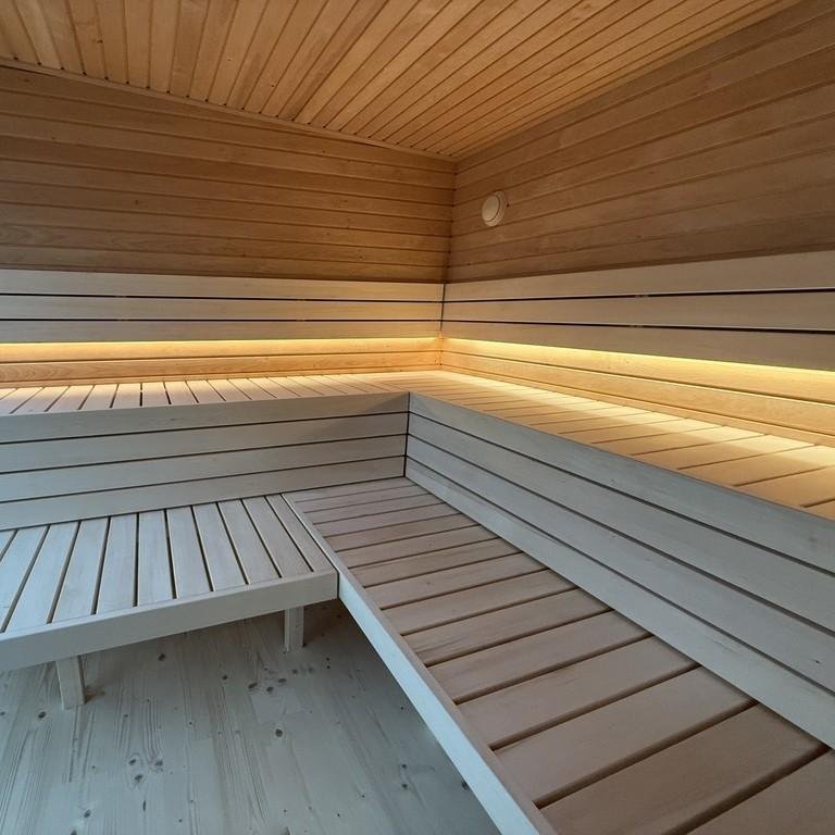 - Osvětlení v sauně je vyřešeno stlumovacími LED pásky schovanými za opěrkami.