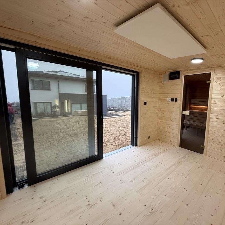 - Okno v sauně je hliníkové, do odpočívárny se vstupuje skrz HS portál. Dekor rámu antracitový.