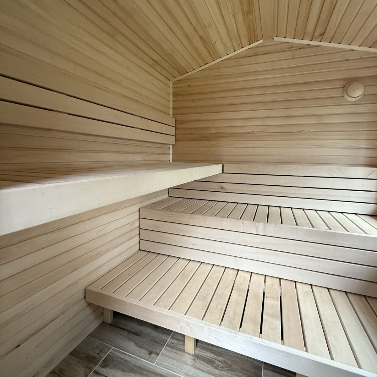 - Interiér je obložen lipovými palubkami, což je ideální saunový materiál díky nízké tepelné vodivosti, příjemnému barevnému tónu a dlouhé životnosti.