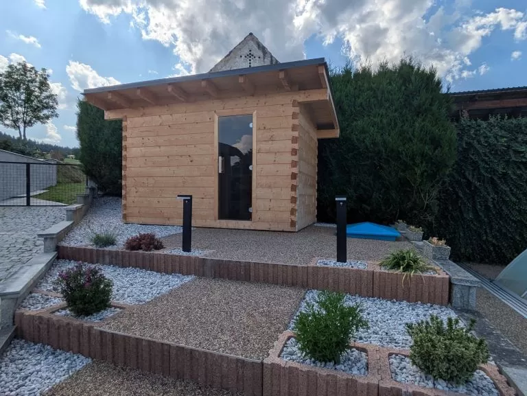 Rodinná sauna s odpočívárnou je umístěna na zahradě u rodinného domu