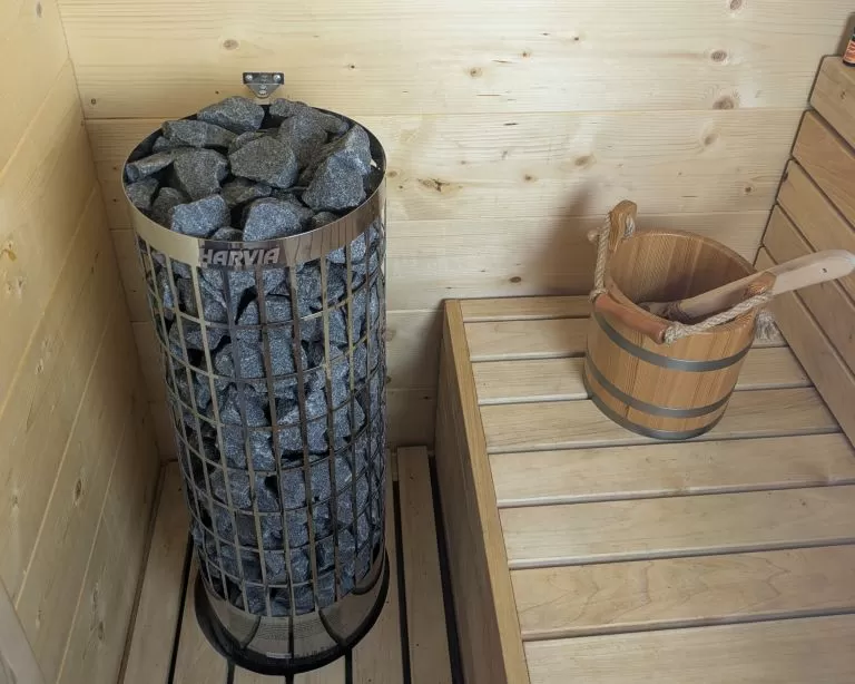 Venkovní sauna je opatřena elektrickými kamny Harvia Cilindro 9 kW s 80 kg kamenů