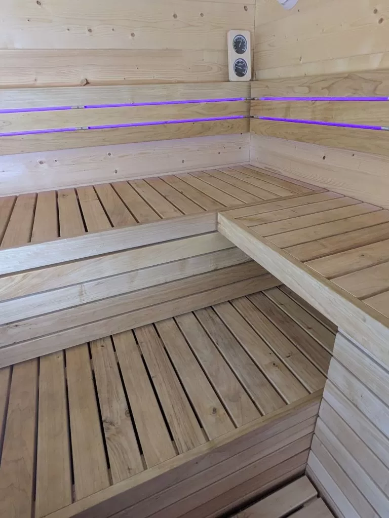 Osvětlení sauny je vyřešeno RGB ledkovými pásy instalovanými za opěrkami sezení